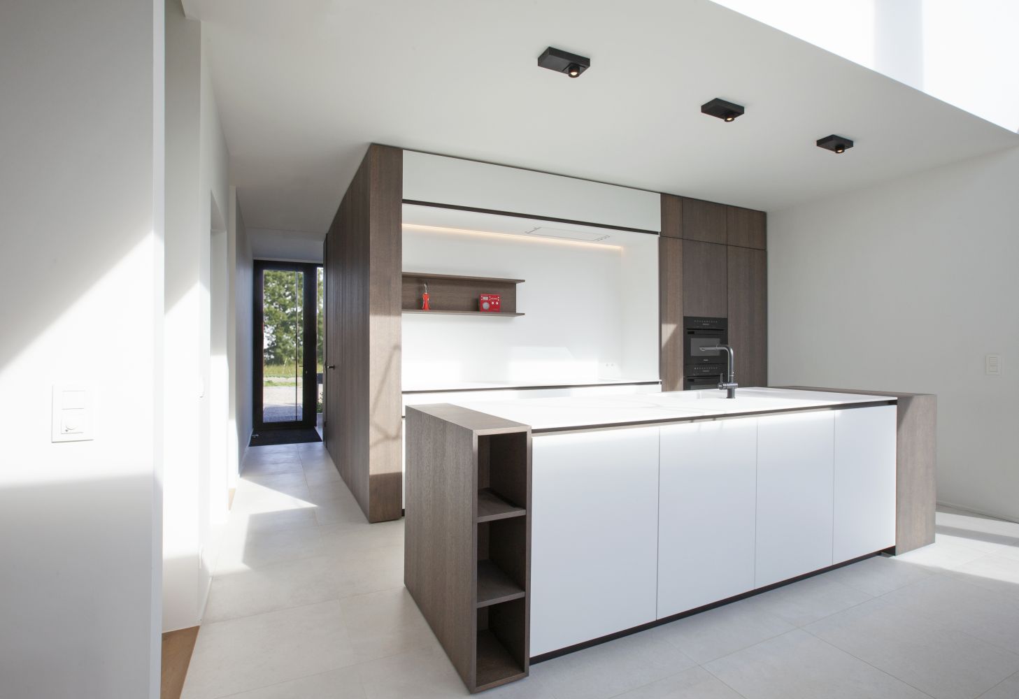 The northern front wall is an enclosed design. A glazed entrance offsets that closedness and at the same time welcomes visitors. The line of sight from the entrance hall through the living room gives a sneak preview of the spaciousness and abundant daylight in the interior.