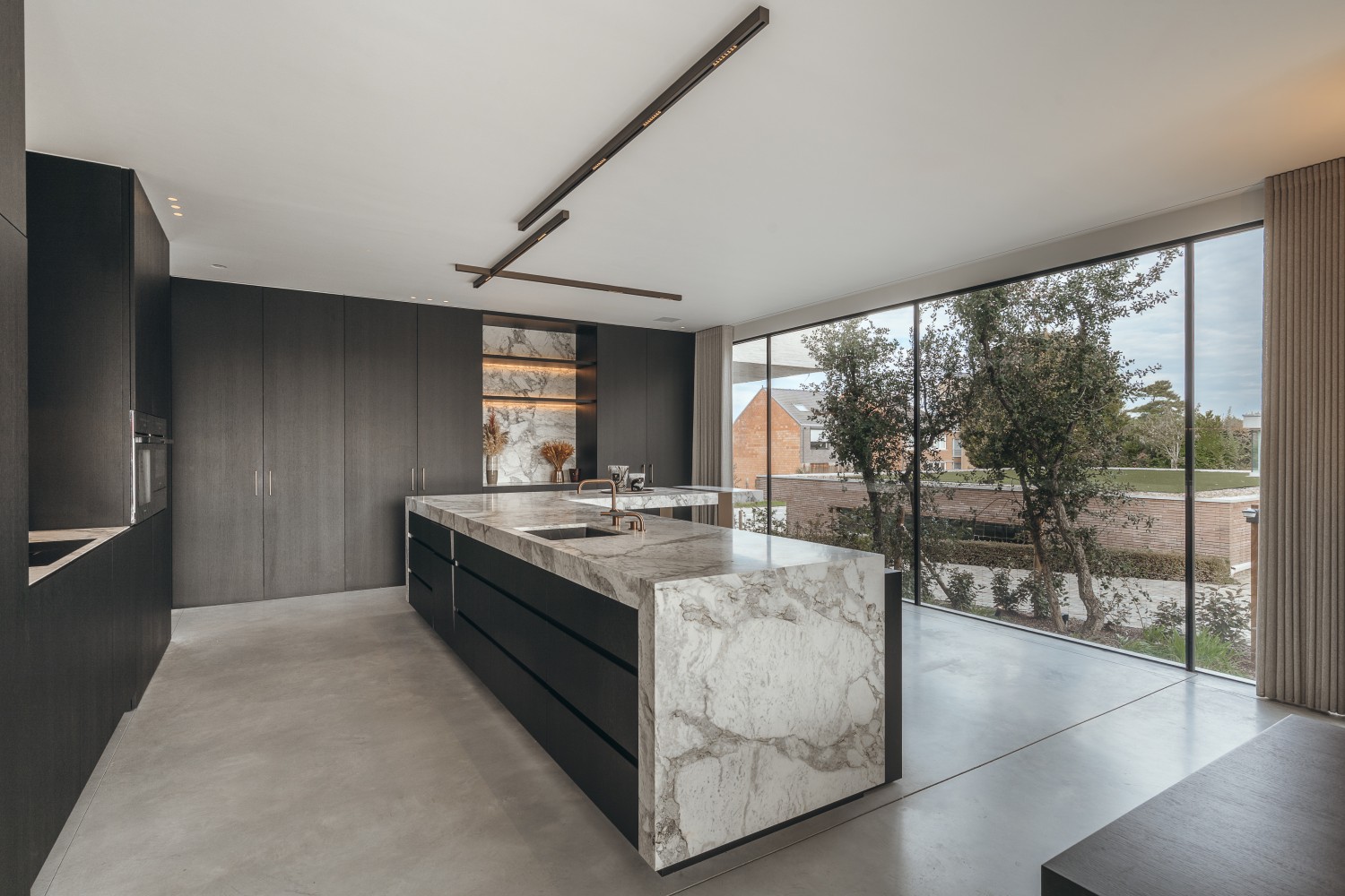 De keuken werd opgevat als meer dan een functionele kookruimte: ze vormt een ontmoetingsplek waar het gezin samenkomt. Het overkragende werkblad wordt gedragen door een breed vormgegeven koperen ondersteuning — een detail dat terugkeert in de op maat ontworpen eettafel en het bureaumeubel op de verdieping, en zo de architecturale samenhang versterkt.