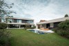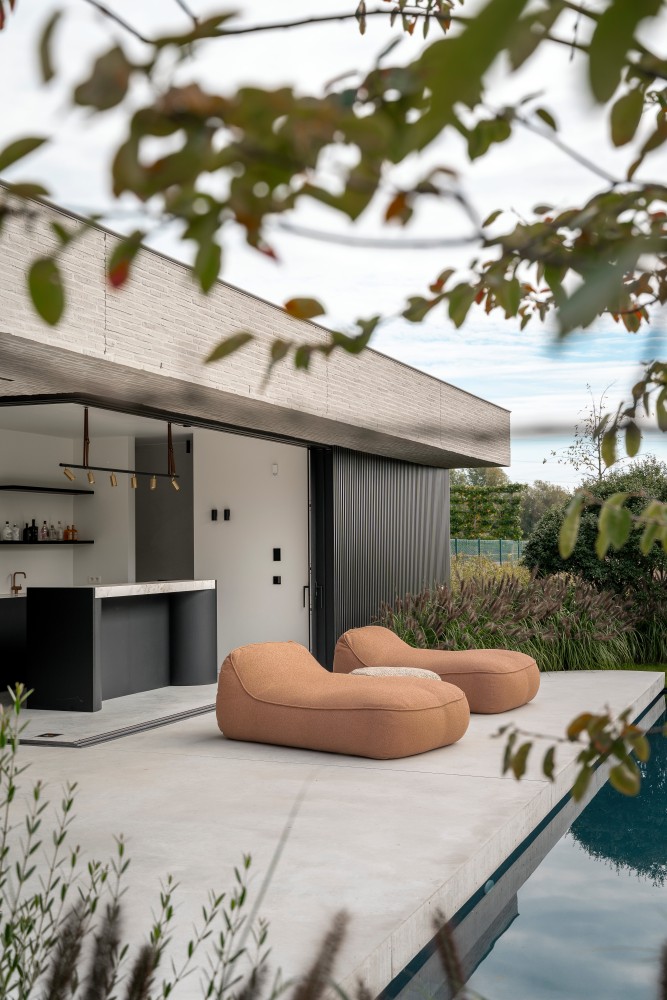 Het poolhouse werd haaks op de woning gepositioneerd om de tuin te begrenzen en spanning te geven. Een insnijding aan de kopzijde creëert een overdekte buitenruimte als verlengde van de woning. Hoekschuiframen verdwijnen in de spouw en maximaliseren de openheid.