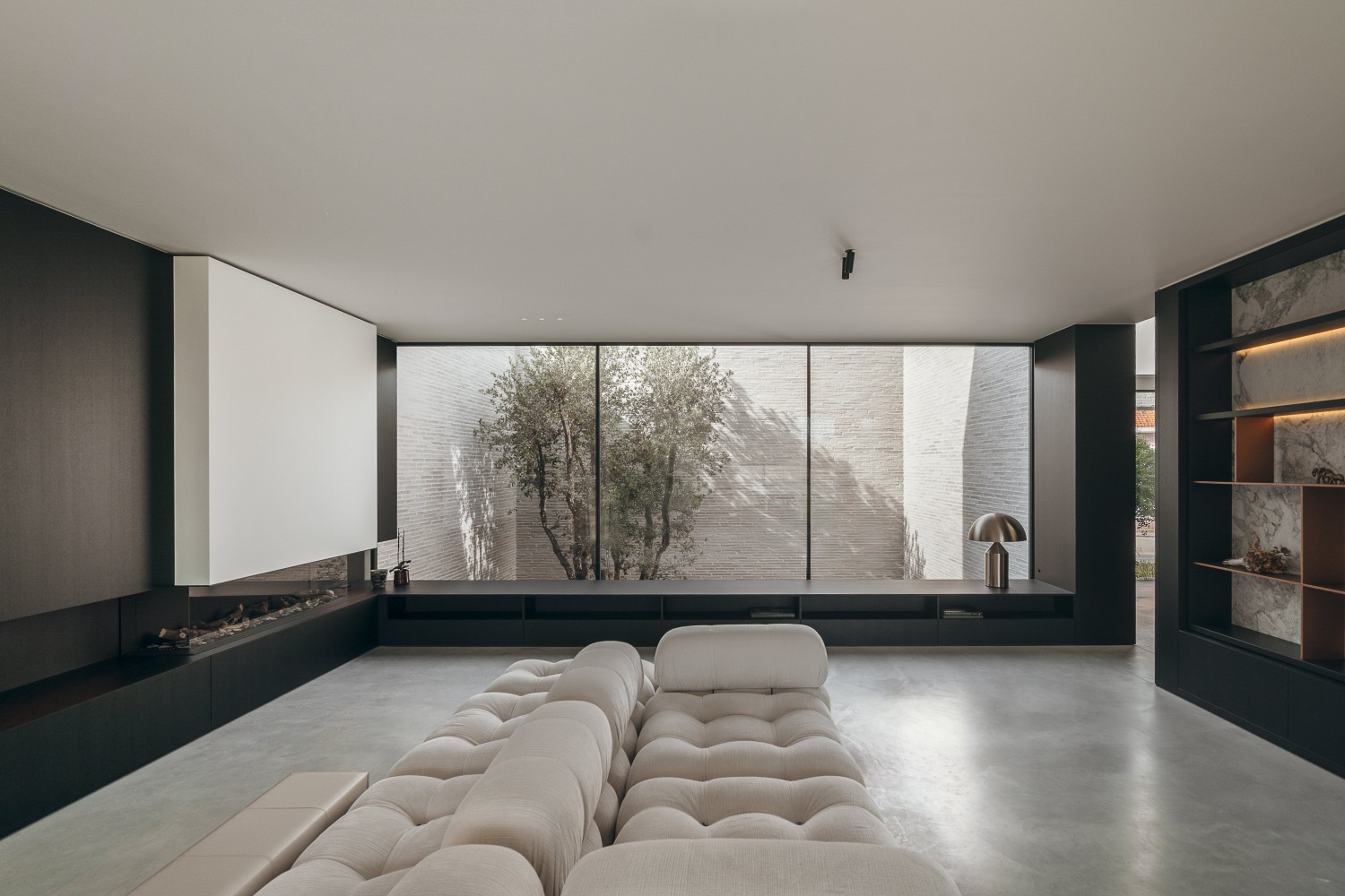 De vensterbank fungeert als zitbank, wordt verlicht via een open legger en vloeit naadloos over in het haardmeubel.