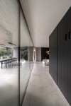 Tot in de details wordt verfijning nagestreefd: gelijkliggend voegwerk, verdoken handgrepen, wisselende wandbekleding, ingepleisterde gordijnrails en dunne leggers verlichten het geheel. Binnen- en buitenvloeren lopen door in beton, ook in de buitentrappen en de natuurlijk verlichte kelder.