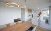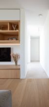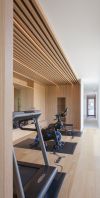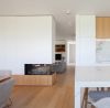 Het interieur van deze woning met praktijkruimte sluit naadloos aan bij de architectuur. In het L-vormige grondplan is de vleugel parallel aan de weg voorbehouden aan de woonfuncties, terwijl de haaks op de weg geplaatste vleugel ruimte biedt aan de praktijk van een sportarts. De leefruimtes zijn op één lijn georiënteerd, van de straat tot de achtertuin, wat zorgt voor een ruimtelijk en open gevoel.