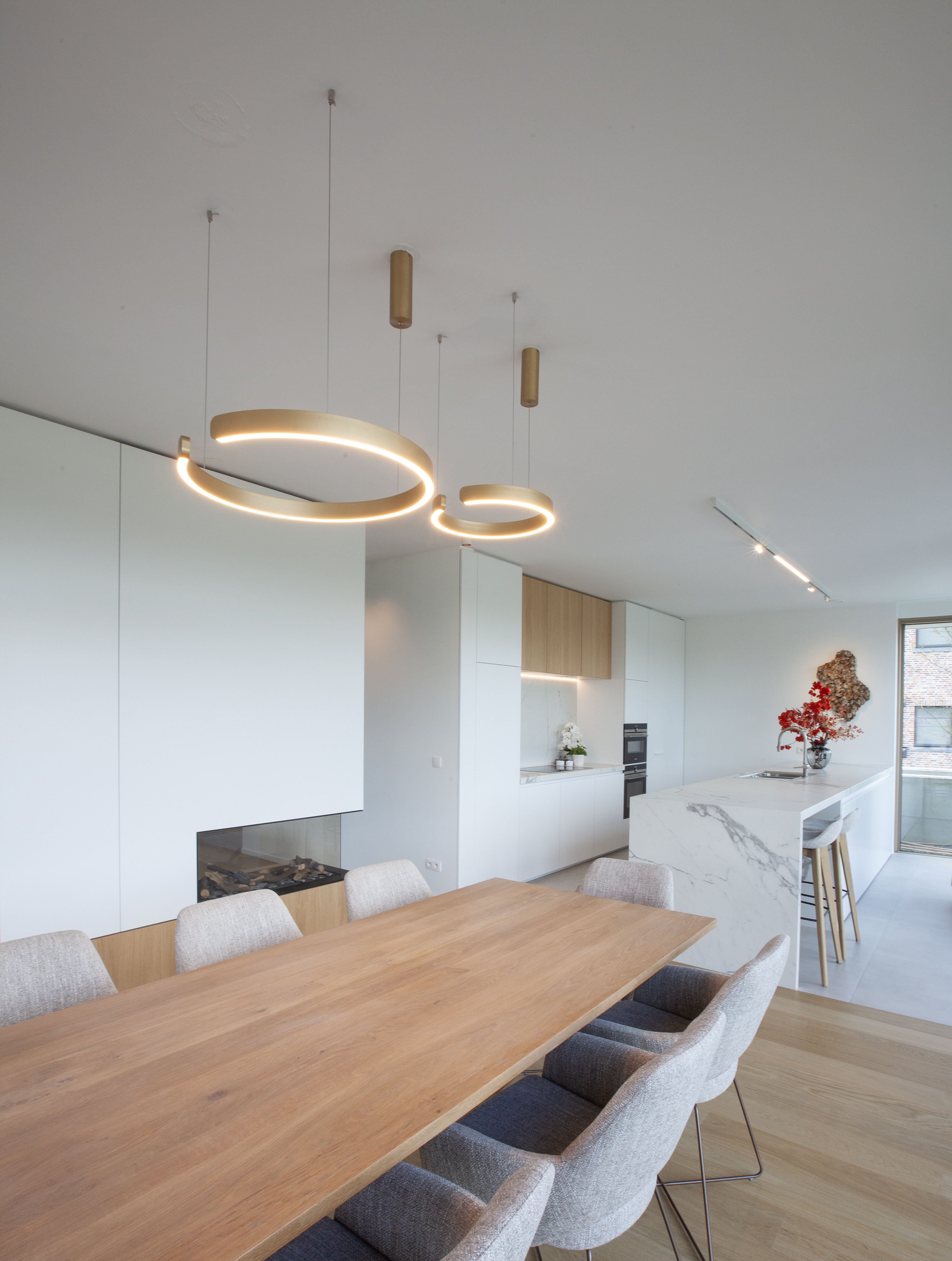 Meubelelementen zoals het kookeiland, de eettafel, de buitentafel en de buitenhaard zijn zorgvuldig op elkaar afgestemd, wat de samenhang binnen en buiten versterkt. De houten vloeren en verfijnde houtaccenten in het maatwerkmeubilair brengen warmte en karakter in het interieur. Ook in de praktijkruimte keert dit materialenpalet terug, waardoor er een visuele en materiële eenheid ontstaat.