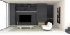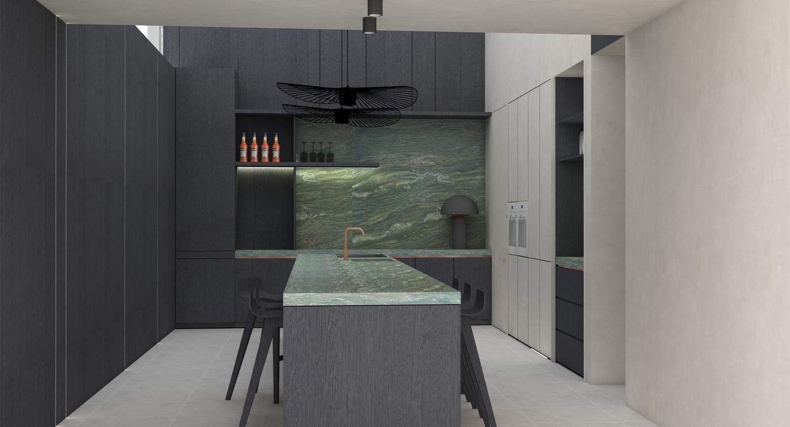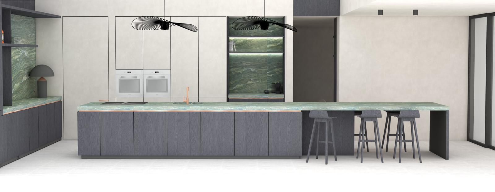 Een centraal eilandmeubel verbindt beide ruimtes en combineert de keukenfuncties met een eettafel. Vanaf dit meubel is er een uitzicht op het overdekt terras en de tuin. De wandbekleding tegen de zijgevel en de kastenwanden tegen de andere muren vormen een beschermende, warme cocon rond dit deel van de leefruimte.